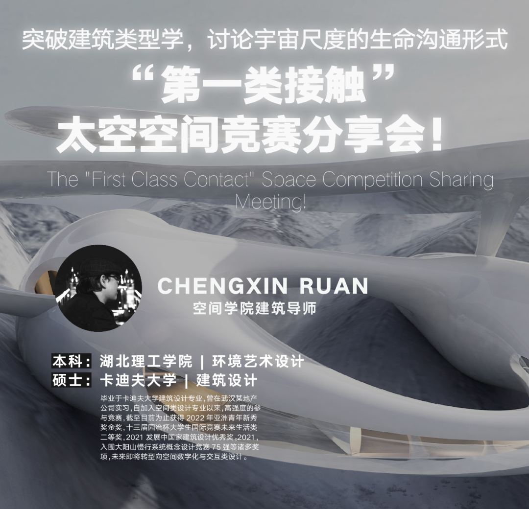本次公开课我们邀请到了建筑导师CHENGXIN RUAN老师为我们做相关分享,老师将基于“费米悖论”讨论宇宙尺度的生命模式,并结合科技的发展将之叙述出来,通过分享人类展馆设计竞赛的一些项目理念及最终目的,带同学们了解如何做超出框架的设计,突破建筑类型学对于博物馆类型的桎梏,明确设计主旨选定,确定设计策略。