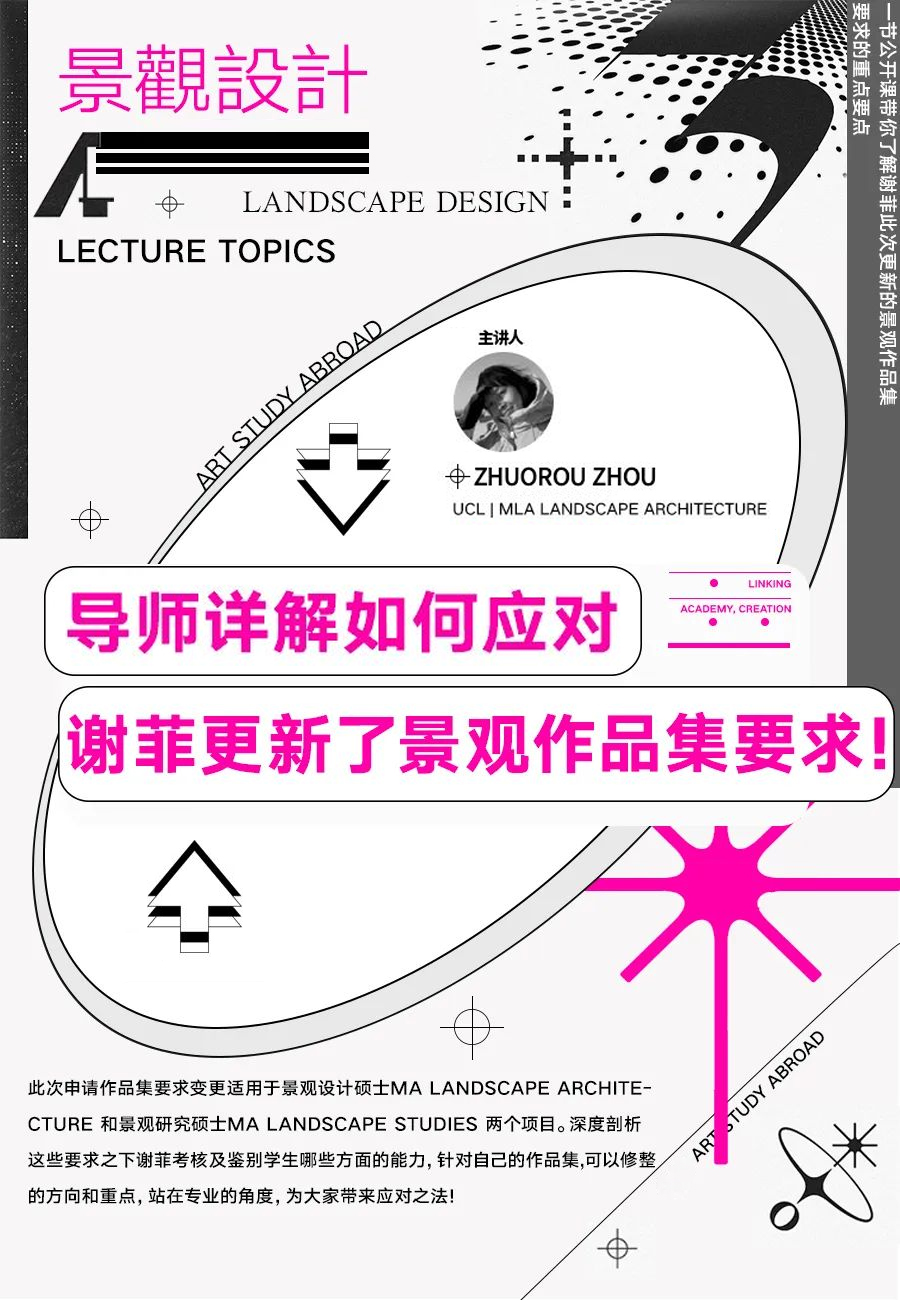 本次公开课,我们邀请了景观导师ZHUORUI ZHOU老师,一节公开课带你了解谢菲此次更新的景观作品集要求的重点要点,深度剖析这些要求之下谢菲考核鉴别学生哪些方面的能力,针对自己的作品集可以修整的方向和重点,站在专业的角度,为大家带来应对之法!